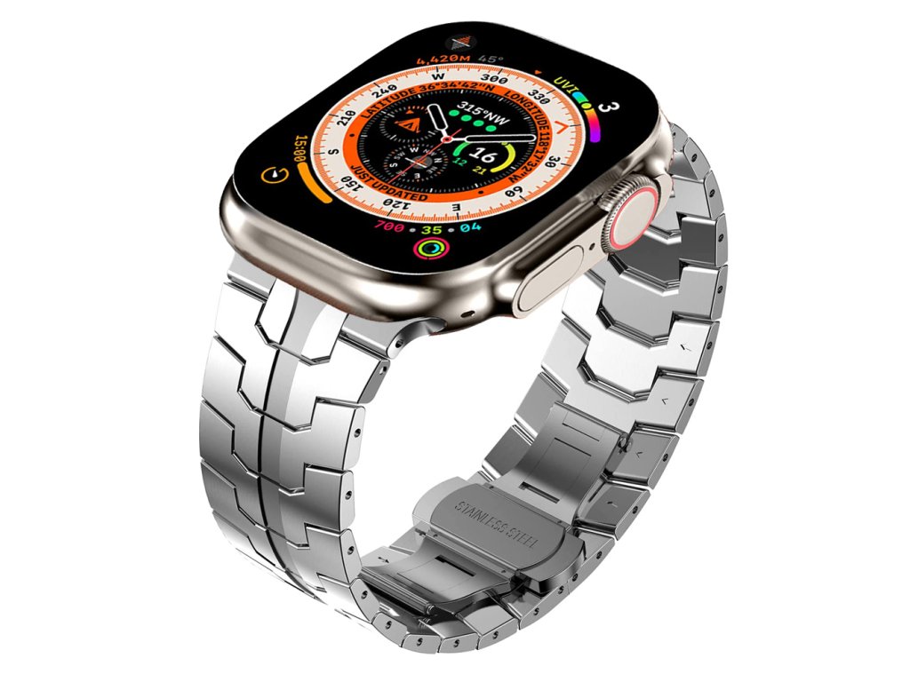 Luxusný a elegantný kovový remienok pre Apple Watch. Vhodný ako na spoločenskú udalosť, tak aj na bežné nosenie. Remienok je vyrobený z chirurgickej ocele. Remienok je tvarovaný do písmena V, čím dodáva remienku jedinečný vzhľad.